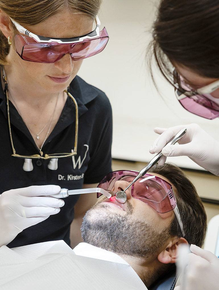 Bevor wir loslegen, wollen wir wissen, was Sache ist. Hierfür schauen wir uns dein gesamtes Zahnsystem an. Mit der Lupe checken wir Zähne, Füllungen, Zahnfleisch, Schleimhäute und Zunge. Was man nicht sieht, zeigen uns präzise dreidimensionale Röntgenbilder (DVT). Mit diesem genauen Bild können wir die Behandlung ganz gezielt auf dich abstimmen.